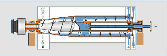 當離心機工作時,鉆井液通過進液管進入離心機,在離心力場作用下,鉆井液在轉筒內壁形成一個液圈。密度大的固相被拋到液圈外層,緊緊貼在轉筒內壁形成固相層,密度小的液相和懸浮的膠體粘土在液圈的內層。螺旋推進器刮板將貼于轉筒內壁的固相層刮下來推向小端脫水區(qū),在脫水區(qū)的固相顆粒受到離心機擠壓和脫水的作用,擠出所有的自由水然后被螺旋推進器送到小端底流噴咀處排出。液圈內層的液相從大端的溢流孔排出機外進入循環(huán)系統(tǒng)。
